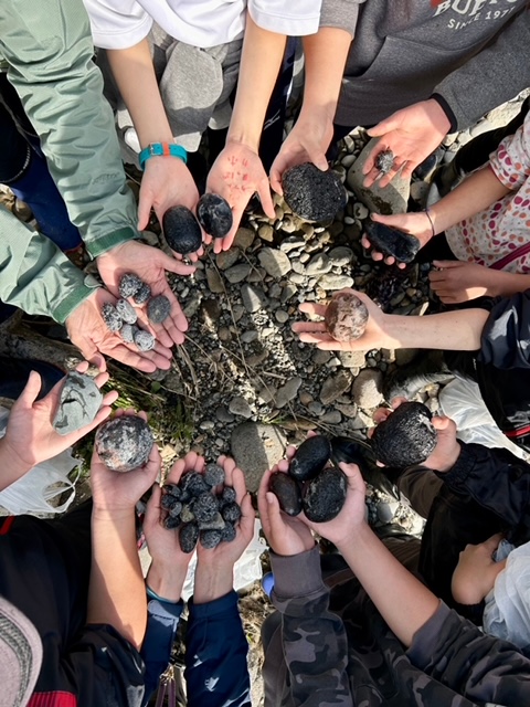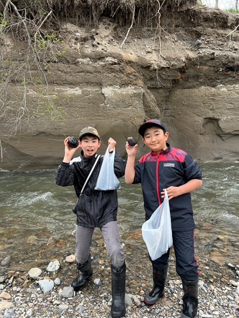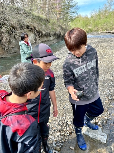 毎年恒例のセンター行事「十勝石拾い」。十勝石は黒曜石のことで、十勝近辺では縄文時代の遺跡から黒曜石で作ったナイフや槍先などが出土しています。火山の噴火でマグマの一部が急速に冷え固まった火山岩。川を下ってきたらキウイフルーツのような形になっているのをよく見かけます。ぴかぴか光って、採ってくれるのを(?)待っているようです。取り始めはどれが十勝石なのか分からず「これ?」「これは?」など質問が多かったですが、次第に目が効き始め、帰るころにはビニール袋が破れてしまうくらいの収穫。これを地元に持ち帰りたい子どもたちと、重すぎてどうやって持ってかえろうか、果たして持ってかえる価値があるのか、と悩む保護者さんの話し合いが近い将来始まることでしょう。子どもたちの関心は、、、だんだん見向きもしなくなることが予想されますが、、、(笑)